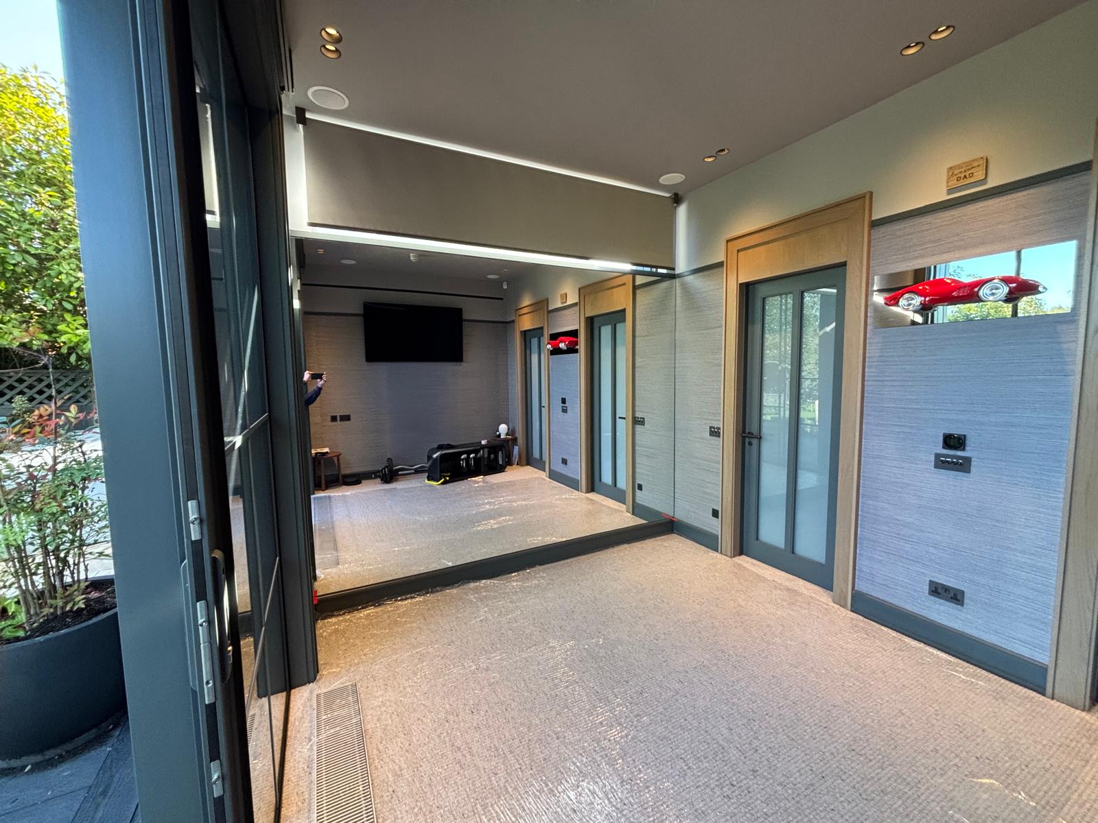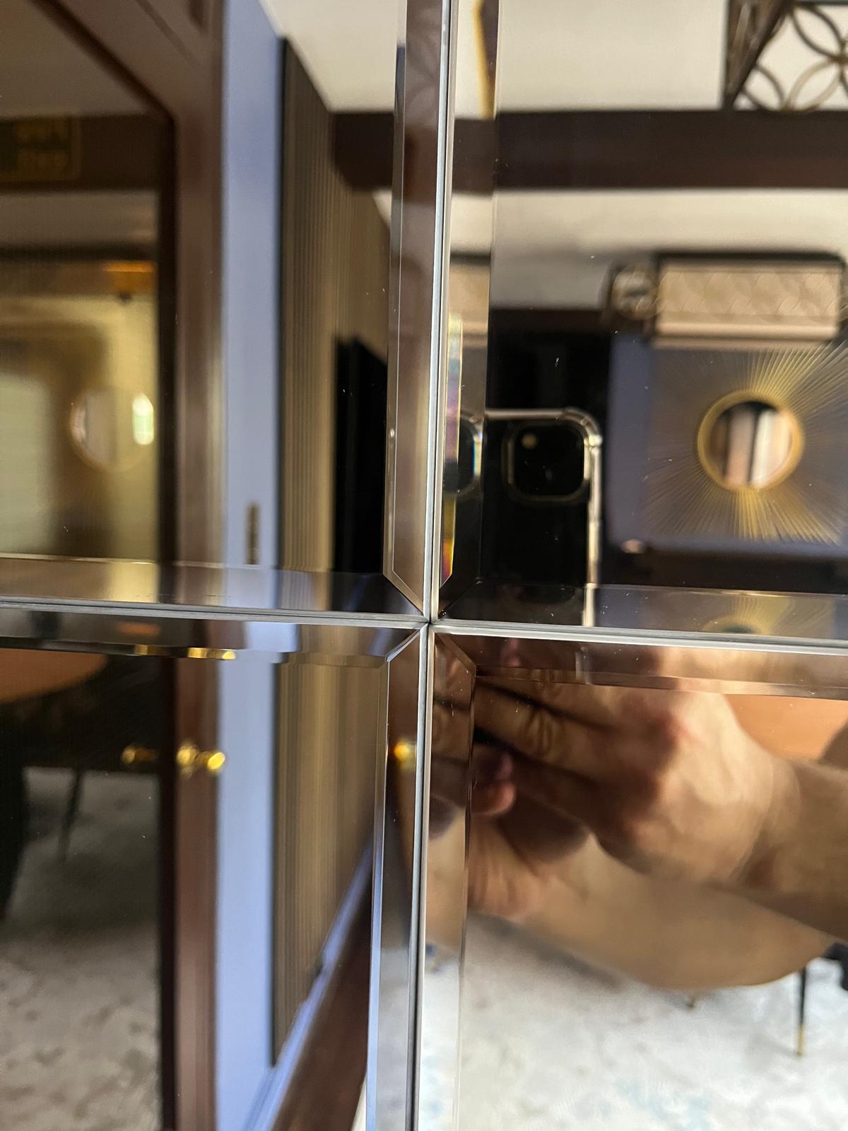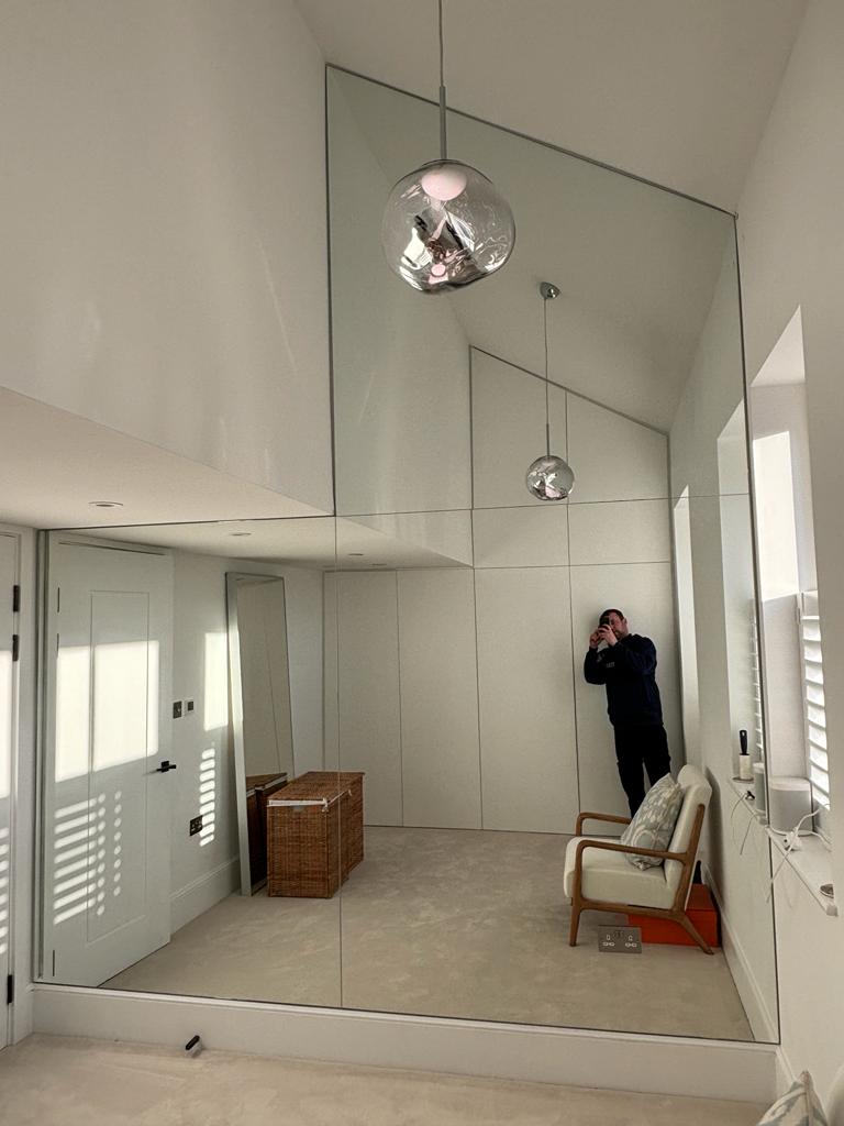 Close-up of mirrored wall panel alignment showing precise joints and clean edges We regularly install gym mirrors, mirrored walls, bathroom mirrors and bespoke glass across residential and commercial settings. We also offer Splashbacks from our sister company.